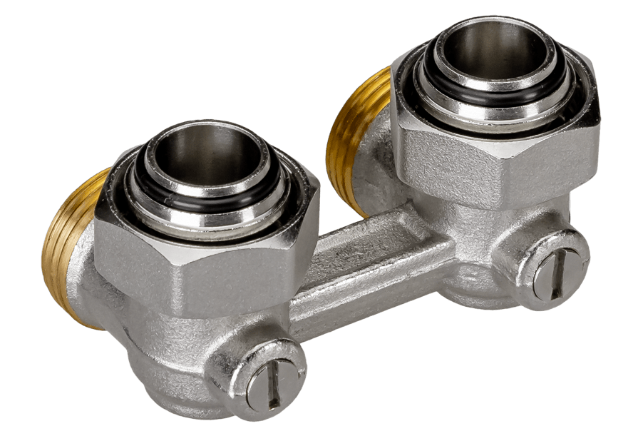 - Клапан РИДАН LV-KB угловой, с переходниками, PN10, межосевое расстояние 50 мм, резьба наружная G 3/4 — наружная R 1/2, KVs 1.4 м³/ч